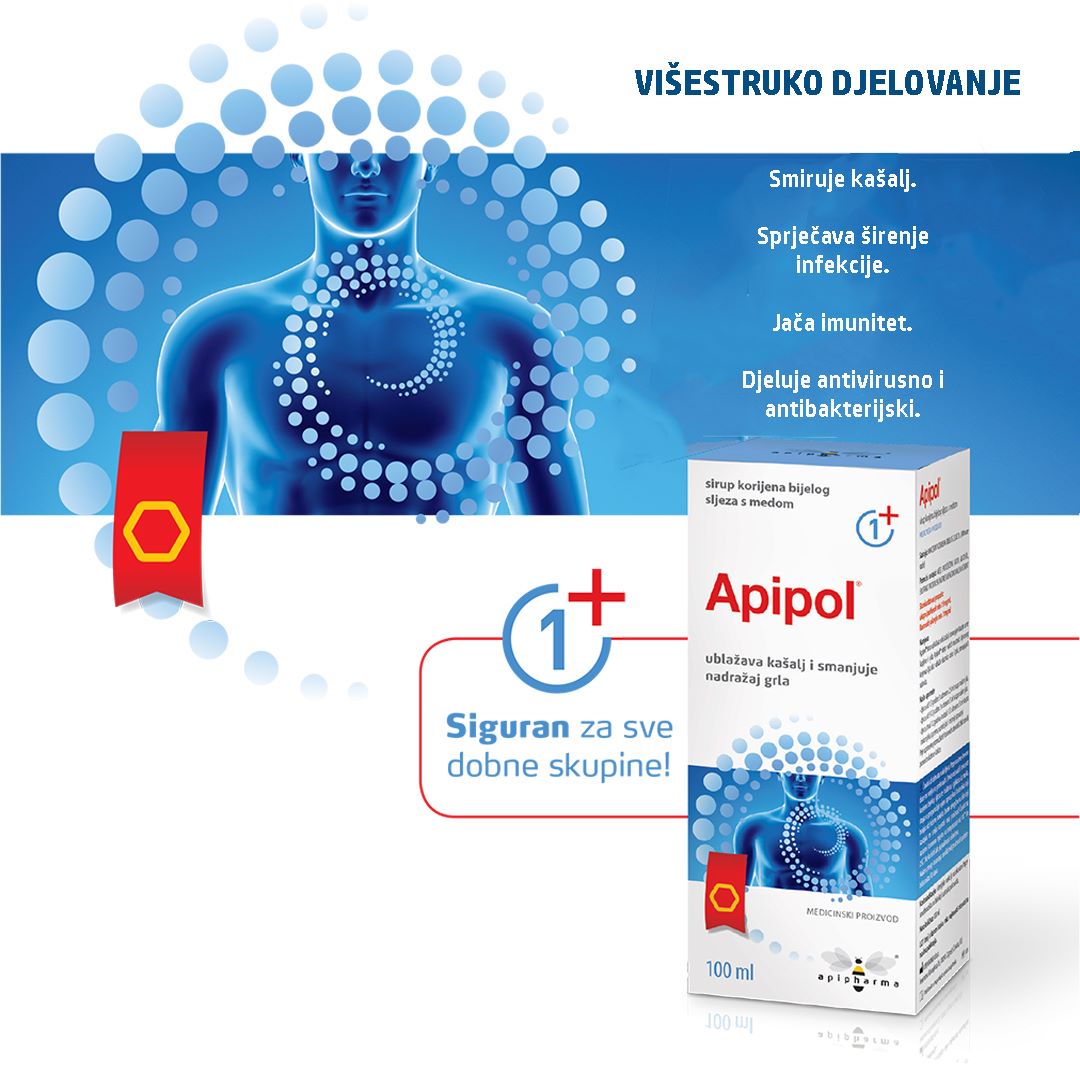 APIPHARMA Apipol medni sirup s maceratom korijena bijelog sljeza, medom i propolisom umiruje suhi kašalj i iritaciju grla. Pogodan za djecu i odrasle, klinički potvrđene učinkovitosti.
