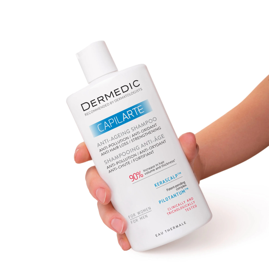 Namijenjen je za svakodnevnu upotrebu kod pojačanog gubitka kose uzrokovanog različitim faktorima, uključujući perimenopauzalnu alopeciju i oštećenja izazvana vanjskim utjecajima. DERMEDIC Capilarte Anti-ageing šampon ne samo da čisti vlasište od nečistoća, već i usporava starenje folikula te poboljšava omjer tamnih prema sijedim vlasima.