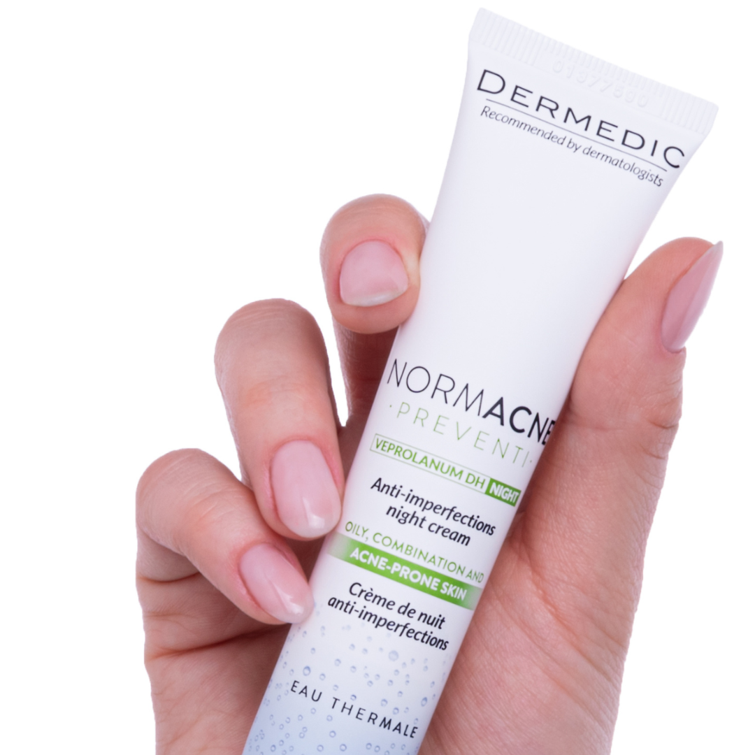 DERMEDIC Normacne noćna krema protiv nepravilnosti preporučuje se kako bi smanjili akne, obnovili kožu i postigli zdraviji, blistav ten. Idealan je izbor za svakodnevnu njegu osjetljive kože sklone nepravilnostima.
