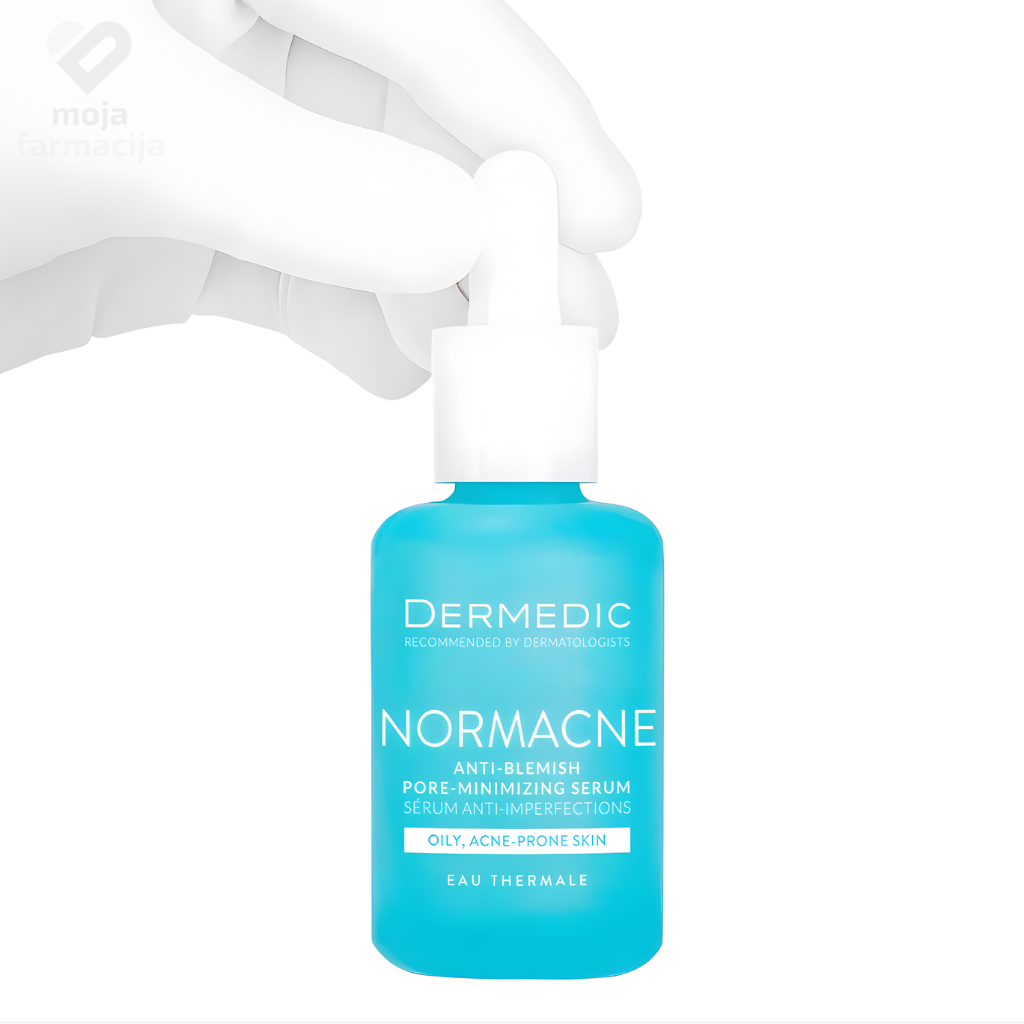 DERMEDIC Normacne Serum je multikiselinski serum za masnu/mješovitu i aknama sklonu kožu (uključujući zrelu). Kombinuje AHA + BHA + PHA + azelaičnu kiselinu sa niacinamidom i Sebupore Control GL-7™ (pat. pending) za brzo i vidljivo čišćenje pora, manji sjaj i ujednačeniji ten. Čisti pore, smanjuje akne i sjaj, zaglađuje kožu; bez mirisa, nekomedogen.