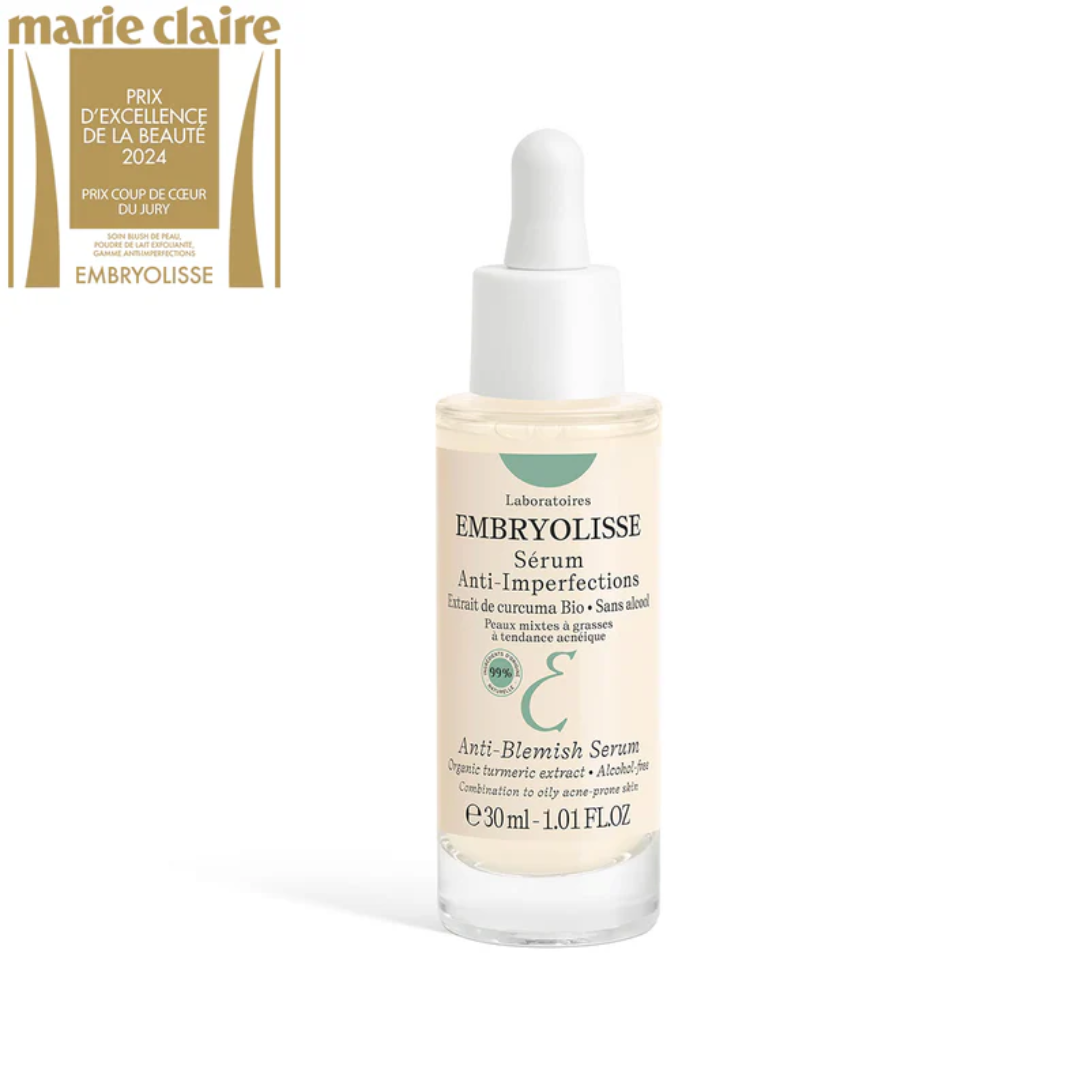 EMBRYOLISSE Anti-Blemish Serum je inovativan tretman za masnu i kombiniranu kožu sklonu nepravilnostima. Zahvaljujući snažnoj formuli s 99% prirodnih sastojaka, uključujući organski ekstrakt kurkume i polilizina, serum učinkovito cilja šest glavnih problema kože: akne, crvenilo, izbijanja, mitesere, tragove i višak sebuma. Njegova nježna formula bez alkohola štiti kožu od isušivanja i povratnog efekta, pružajući dugotrajne rezultate bez iritacija.