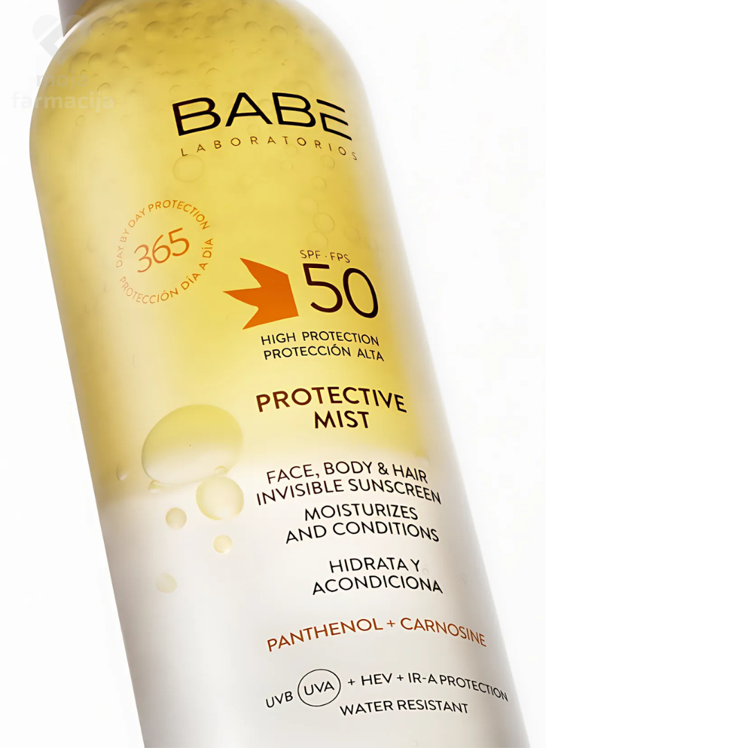 LABORATORIOS BABÉ Protective Mist SPF50 je višenamjenski sprej sa SPF50 koji pruža širokospektralnu zaštitu od UVA, UVB, HEV i IR-A zraka za lice, tijelo i kosu. Zahvaljujući svojoj dvofaznoj formuli s antioksidativnim djelovanjem, ovaj sprej istovremeno štiti, hidrira i obnavlja kožu, dok kosi pruža zaštitu i mekoću, idealno i za vlasište sklono oštećenjima od sunca.