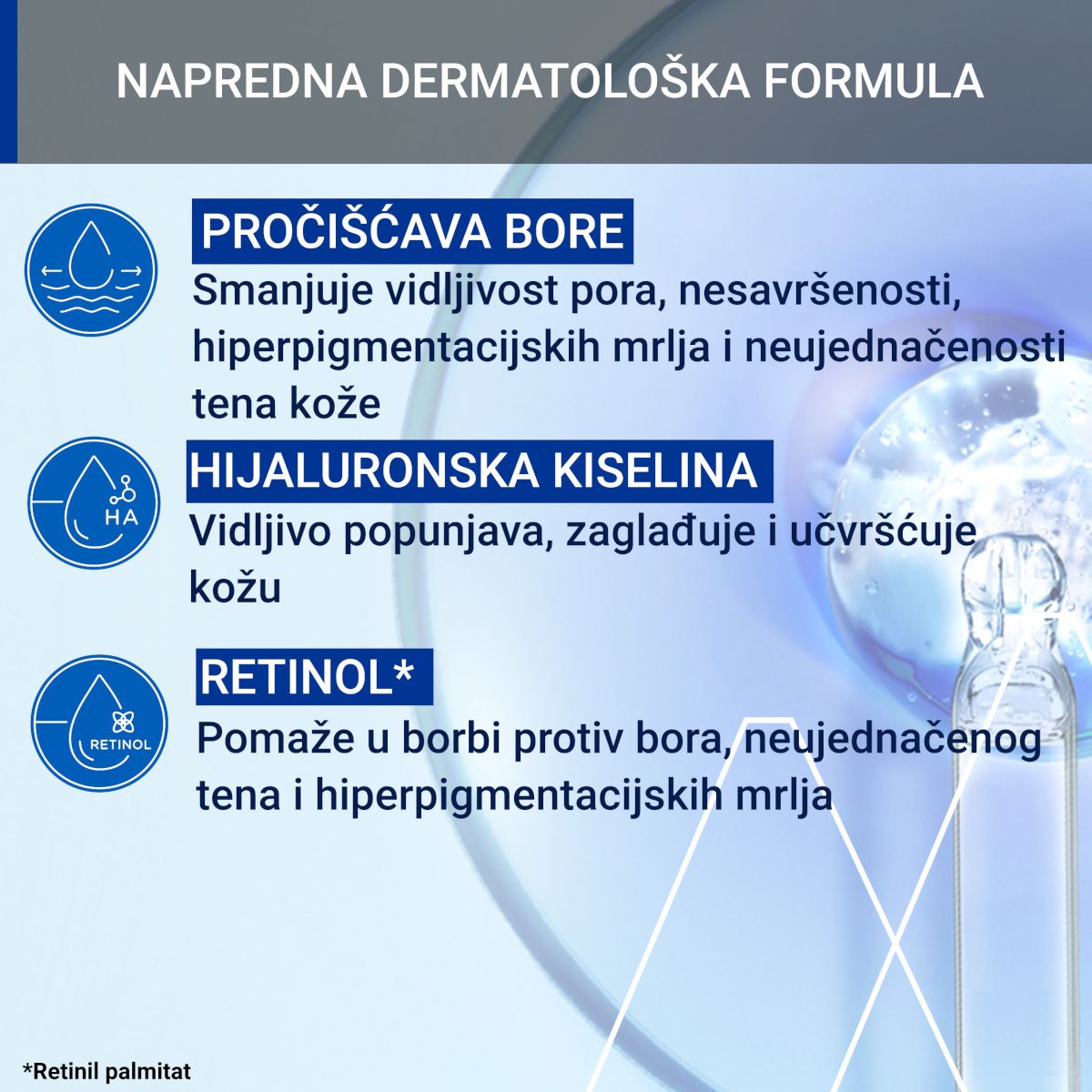 Aktivni sastojci protiv starenja: (RETINOL + HIJALURONSKA KISELINA + REFINER PORA)