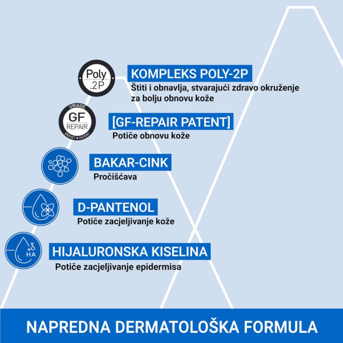 Sastav: Uriage termalna voda,GF-obnavljajući kompleks,smektit,Poly-2P patentirani kompleks, cink oksid,D-pantenol,hijaluronska kiselina,organski silikon.