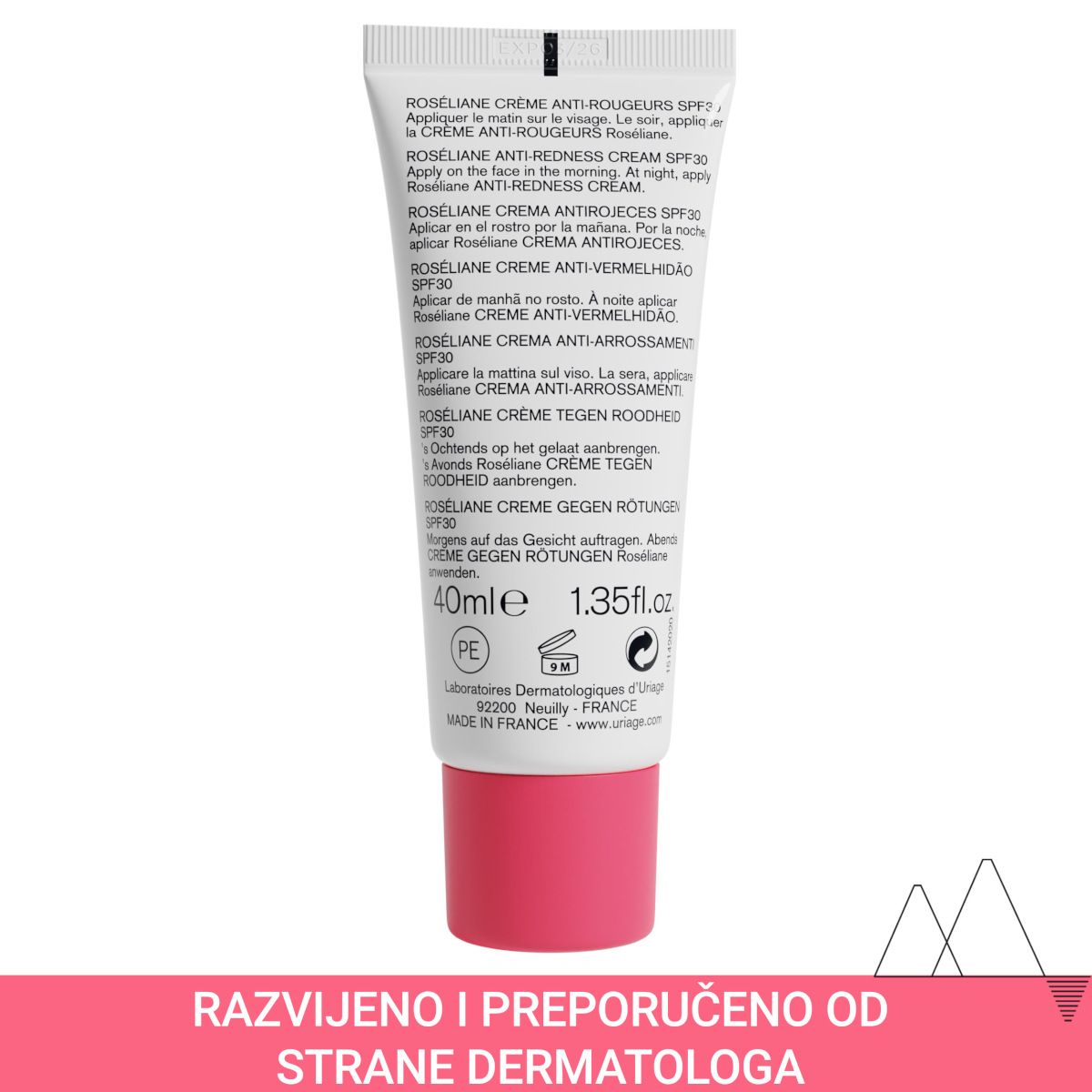Roseliane krema predstavlja kompletno rješenje za osjetljivu kožu sklonu crvenilu. Štiti,umiruje, hidrira i dekongestuje kožu. Zahvaljujući ekskluzivnoj patentiranoj mješavini aktivnih sastojaka i Uriage termalnoj vodi, obnavlja i jača kutaneusnu barijeru i efikasno štiti kožu od dejstva UVA i UVB zraka.