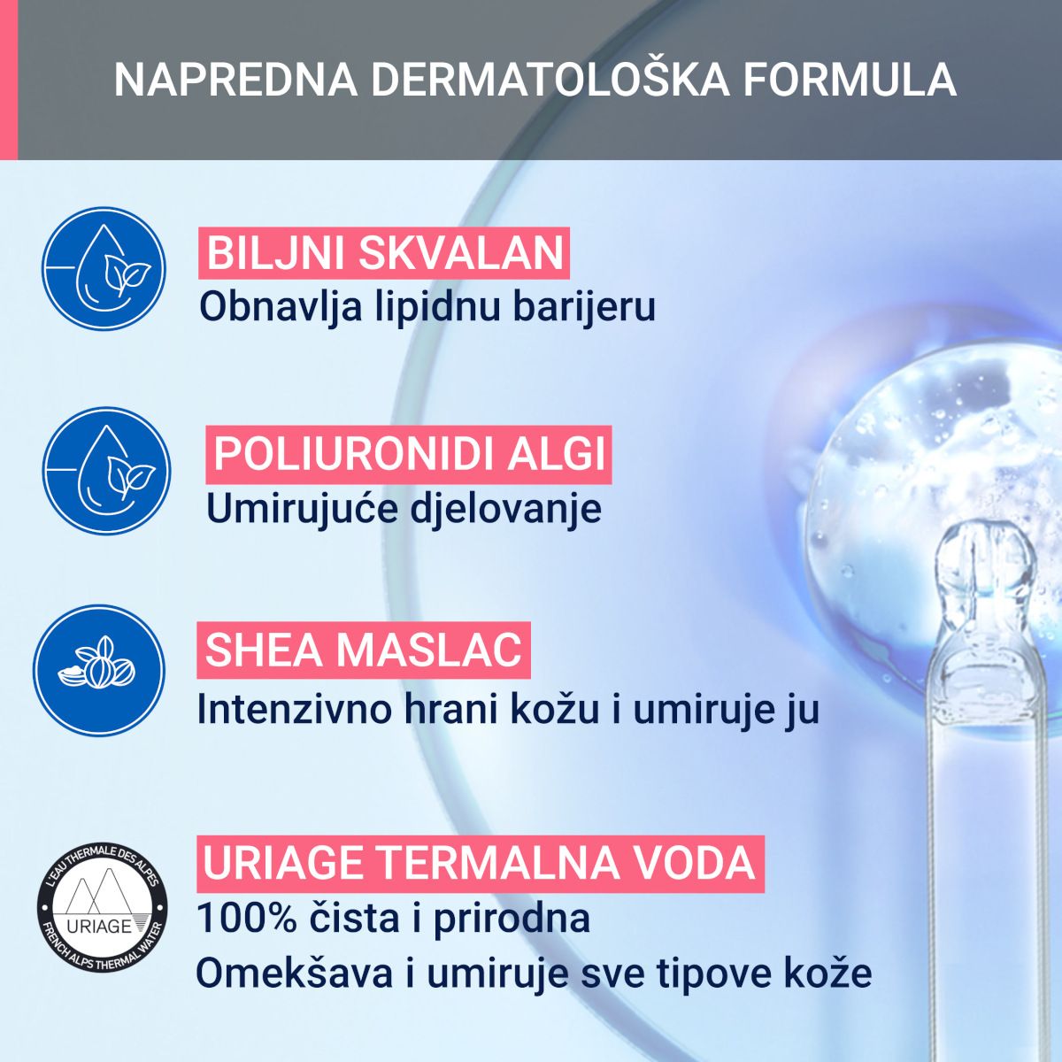 Ova krema je specijalno formulisana da zadovolji potrebe hiperreaktivne i netolerantne suhe i veoma suhe kože. Bogata, kremasta formula koja pruža dugotrajan komfor koži. Dubinski hrani i njeguje kožu, djeluje i preventivno i terapeutski umirujući osjećaj diskomfora, peckanja i zategnutosti zahvaljujući kombinaciji poliuronida algi i Uriage termalne vode.