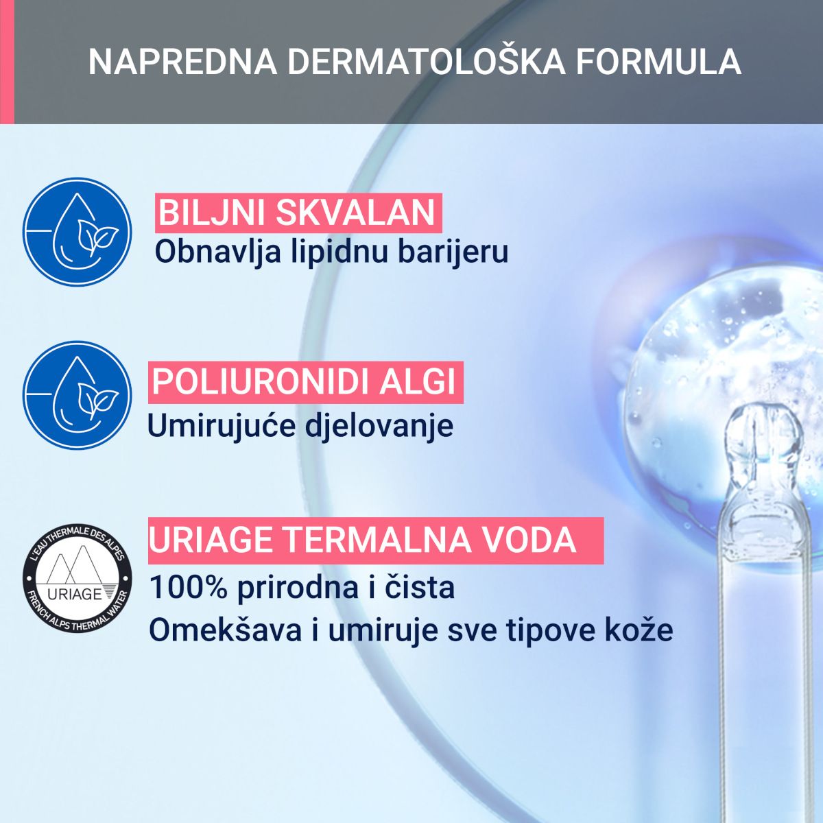 - Uriage termalna voda (10%): Umiruje i štiti kožu, dok kontrolira tri ključna neuro-receptora koji su odgovorni za osjetljivost kože.