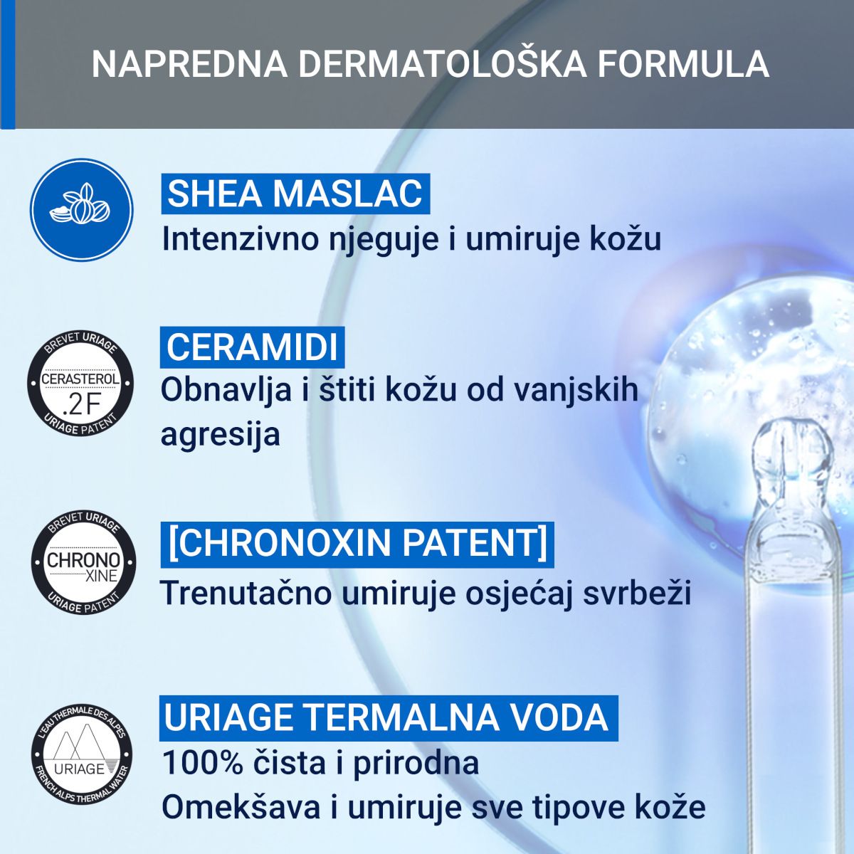 🧪 Ključni sastojci: 10% Shea puter, Illipe ulje, Chronoxine, Cerasterol 2F, TLR2-Regul, Uriage termalna voda.