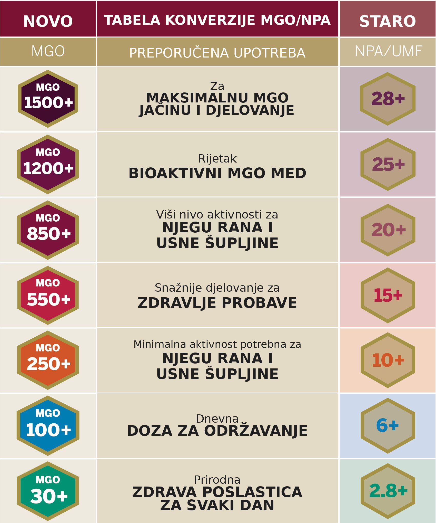 MGO je supstanca koja mu daje moćno antibakterijsko djelovanje. Za razliku od običnog meda, čiji se efekat lako razgradi toplinom ili svjetlom, MGO je stabilan i ostaje aktivan čak i u organizmu.
