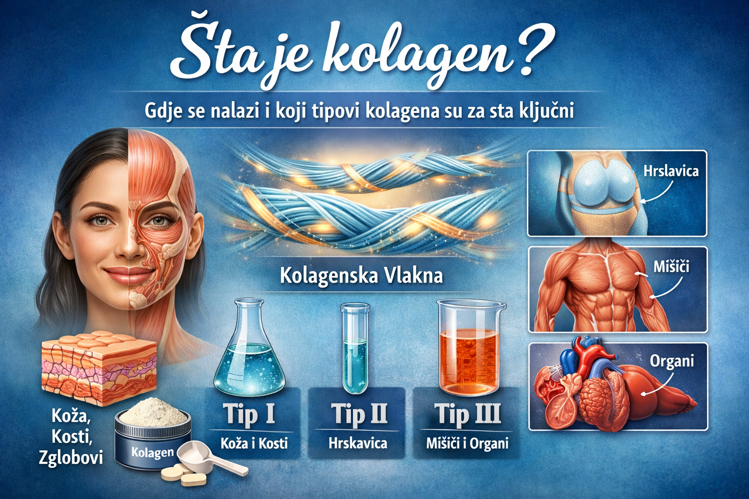 Kolagen je najzastupljeniji protein u ljudskom tijelu. On je bukvalno “ljepilo” koje drži naše organe, mišiće, kosti i kožu na okupu. Postoji preko 28 tipova kolagena, ali za ljudsko tijelo su najvažnija prva tri: