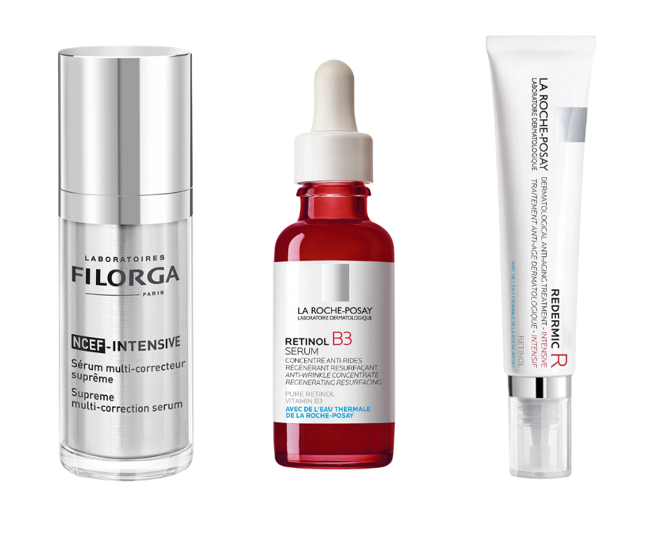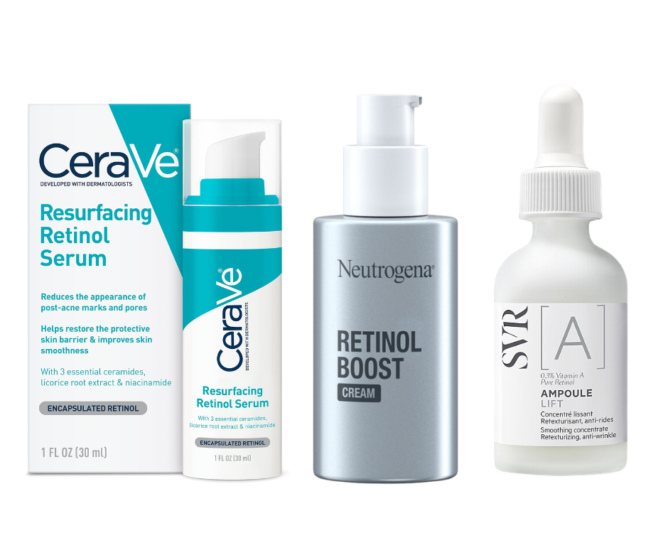 Retinol ( sporiji rezultati bez iritacija), granaktivni retinoid (efektivno djelovanje bez iritacija), retinaldehid (efektivniji za dublje bore) ili esteri retinoične kiseline poput retinil retinoata (napredne bore)