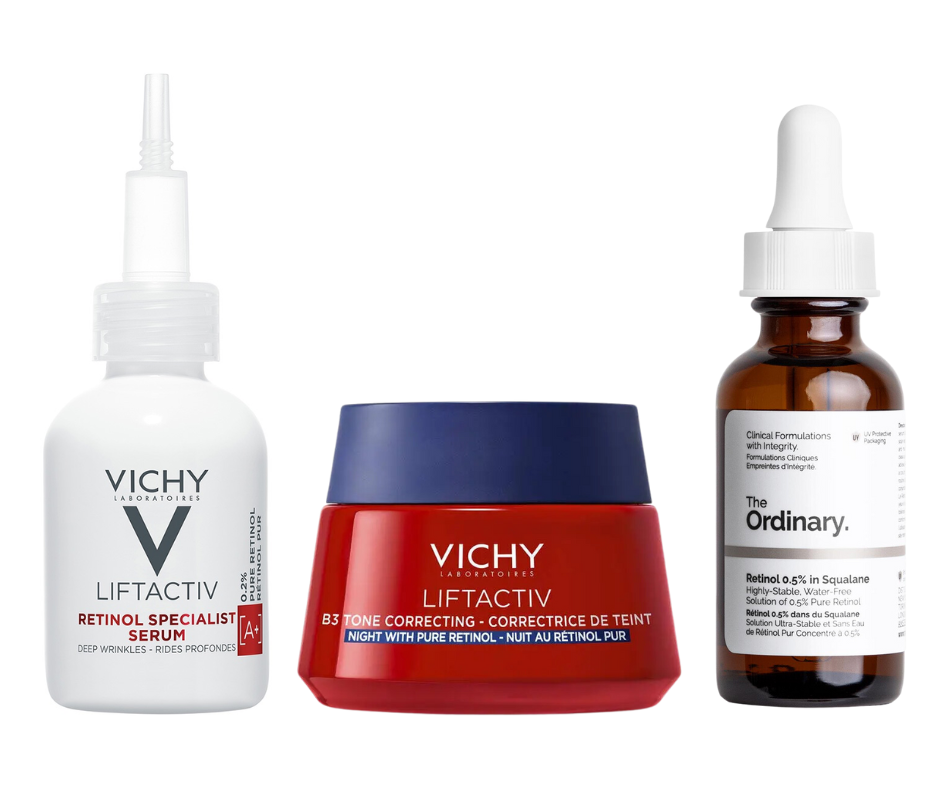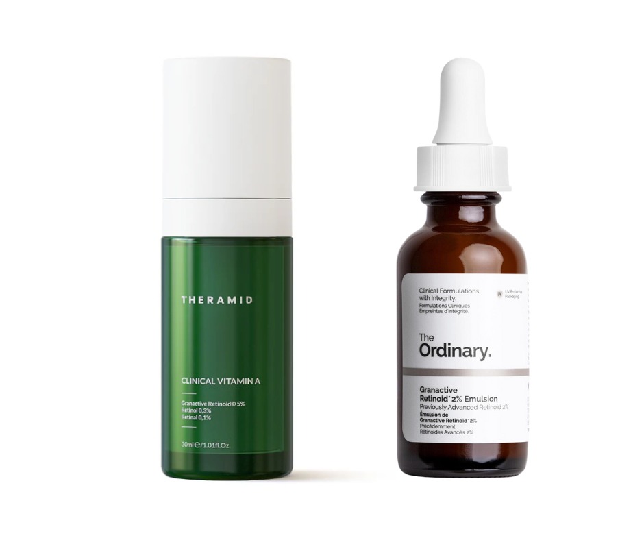 Retinol ( sporiji rezultati bez iritacija), granaktivni retinoid (efektivno djelovanje bez iritacija), retinaldehid (efektivniji za dublje bore) ili esteri retinoične kiseline poput retinil retinoata (napredne bore)